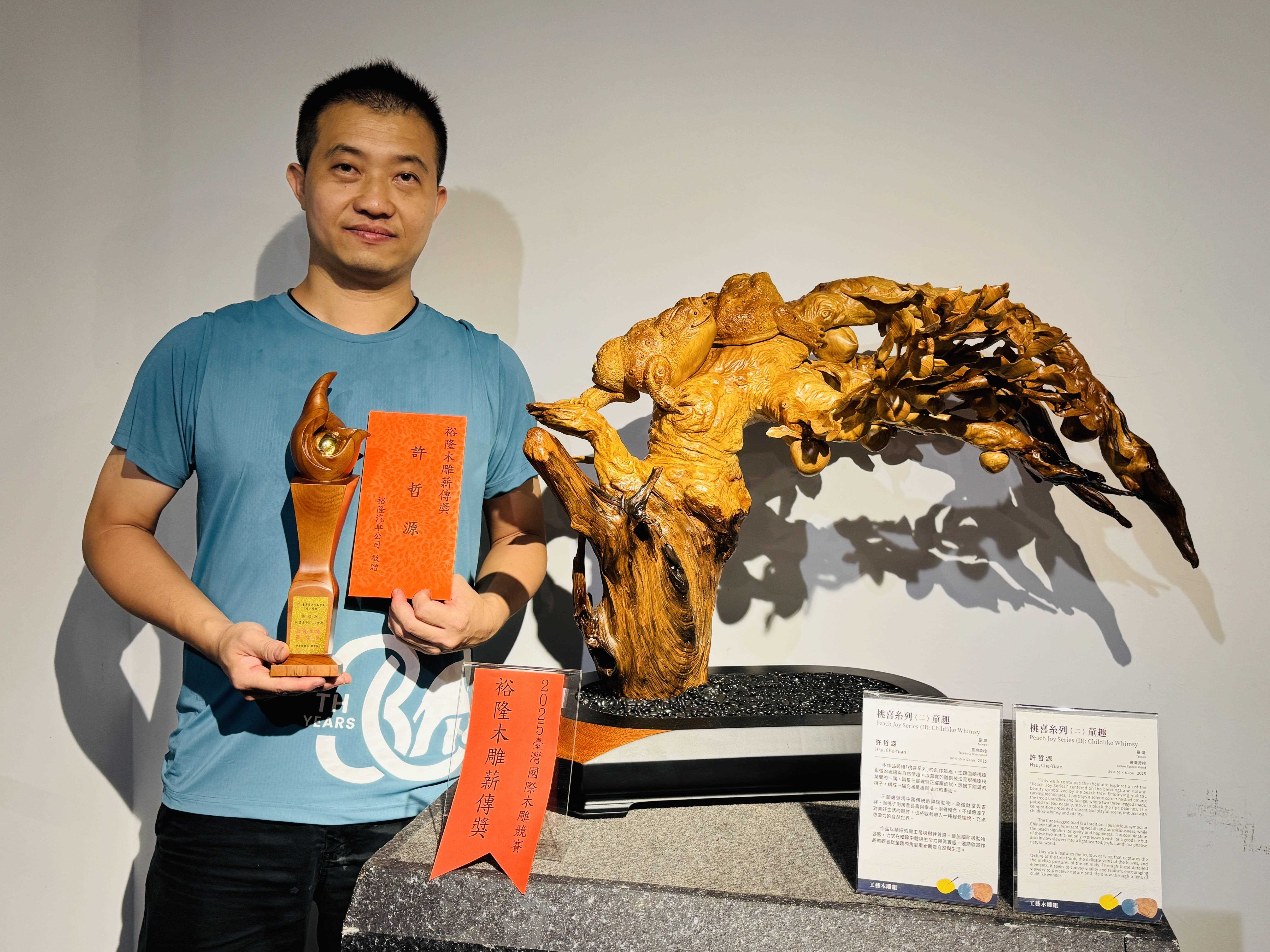 今年「裕隆木雕創新獎」由李承翰獲得殊榮,作品《雨後-顛倒世界》以細膩構思帶入現代創作,展現木雕藝術的新視野;「裕隆木雕薪傳獎」則由許哲源獲獎,其作品《桃喜系列(二)童趣》以精細的雕工呈現樹幹質感,葉脈細節及動物姿態,在細節中體現生命力與真實感。